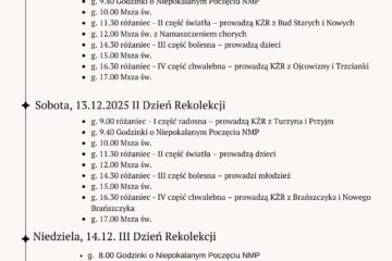 Piątek, 12.12.2025 I Dzień Rekolekcji g. 9.00 różaniec – I część radosna – prowadzą KŻR z Niemir i Knurowca g. 9.40 Godzinki o Niepokalanym Poczęciu NMP g. 10.00 Msza św. g. 11.30 różaniec – II część światła – prowadzą KŻR z Bud Starych i Nowych g. 12.00 Msza św. z Dowiedz się więcej…