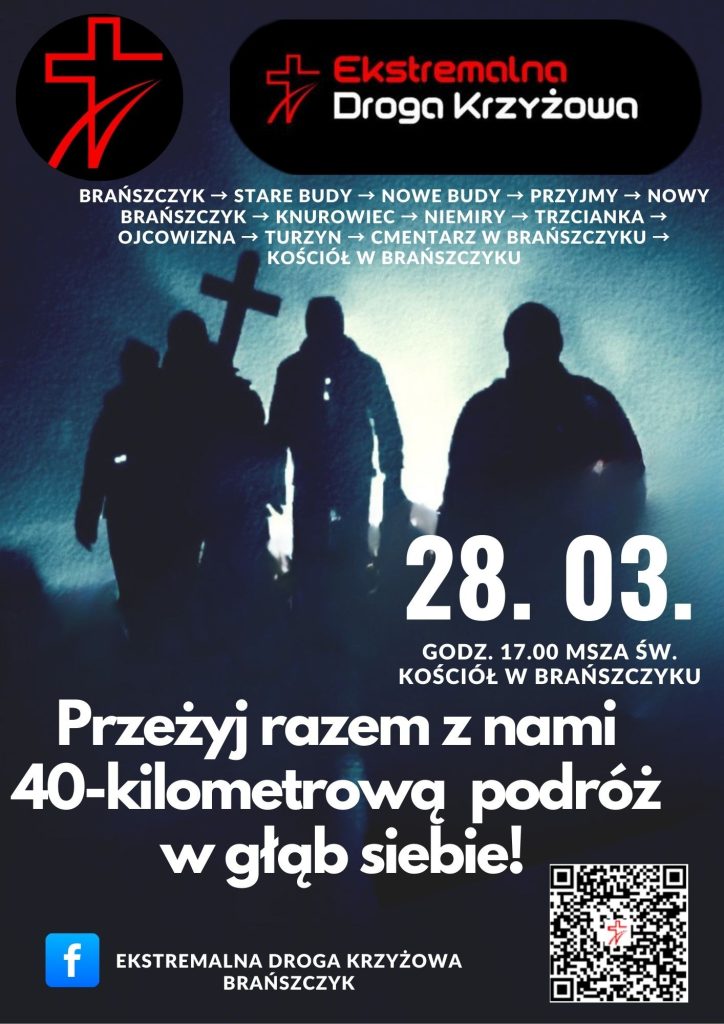 W Brańszczyku Ekstremalna Droga Krzyżowa zaplanowana jest na piątek 28 marca 2025r. na godzinę 17.00 kiedy rozpocznie się Msza święta a po niej uczestnicy wyruszą w trasę. Aby zapisać się i zapoznać z zaplanowaną trasą należy wejść na stronę www.edk.org.pl i odnaleźć rejon Brańszczyk